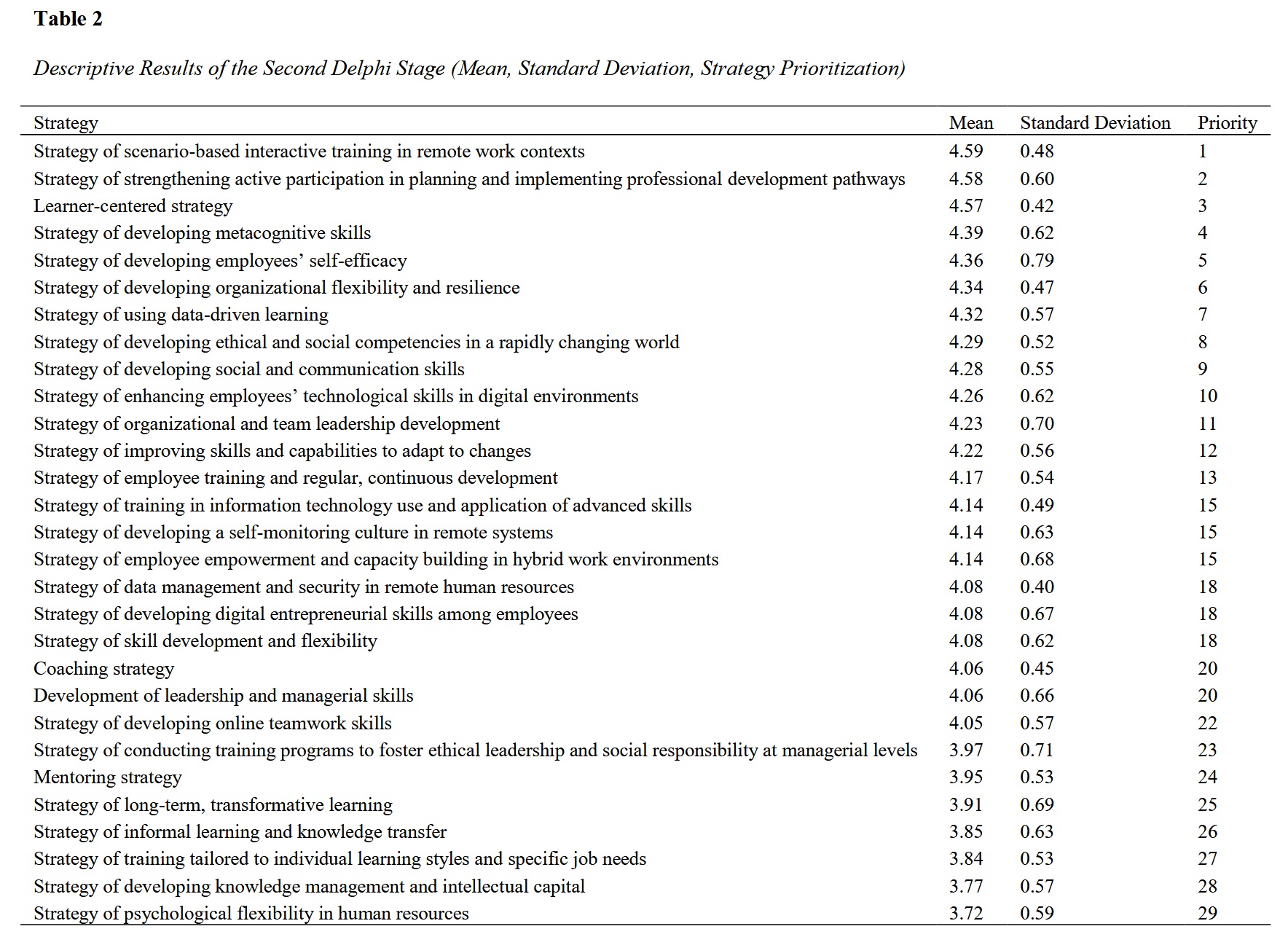 With the growing expansion of remote work and the transformation of workplace structures, organizations—particularly in the public sector—have encountered new challenges in the field of human resource development. This transformation requires the redesign of strategies tailored to technology-driven, non-face-to-face work environments. The purpose of this study is to identify and analyze effective human resource development strategies under remote work conditions, with a focus on the operational context of the Iraqi Ministry of Planning. This study employed a mixed-methods approach (qualitative–quantitative) and was conducted in three stages. In the first stage, through a systematic review of the scientific literature, 33 initial strategies were collected. Subsequently, by implementing two rounds of the Delphi method with the participation of 14 experts, the final list of 29 strategies was extracted. In the third stage, exploratory factor analysis was applied to identify the conceptual dimensions of the strategies, resulting in three main axes: “individual and professional empowerment,” “team and organizational cultural development,” and “digital transformation of human resources.” The findings revealed that human resource development in the context of remote work requires a comprehensive, technology-oriented, and flexible perspective that must align with the characteristics of virtual work environments and the requirements of public organizations. Furthermore, recommendations were provided for designing blended training programs, strengthening virtual interactions, and enhancing employees’ technological empowerment. By localizing global approaches within Iraq’s administrative structures, this study has taken an innovative step toward formulating human resource development policies under remote work conditions.