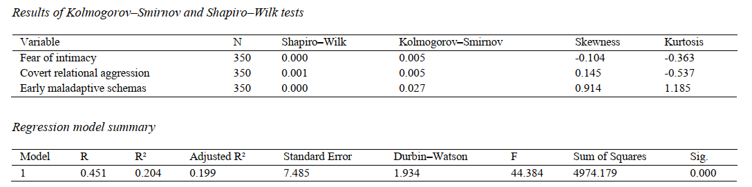Findings: The results of multiple regression analysis showed that only fear of intimacy could significantly predict covert relational aggression (β = 0.428, p < 0.001), whereas early maladaptive schemas did not have a significant role in predicting this variable. Moreover, the results of the two subsidiary hypotheses indicated that there was a significant relationship between early maladaptive schemas and covert relational aggression, as well as between fear of intimacy and covert relational aggression. Consequently, fear of intimacy can be considered an influential factor in the occurrence of covert aggression.