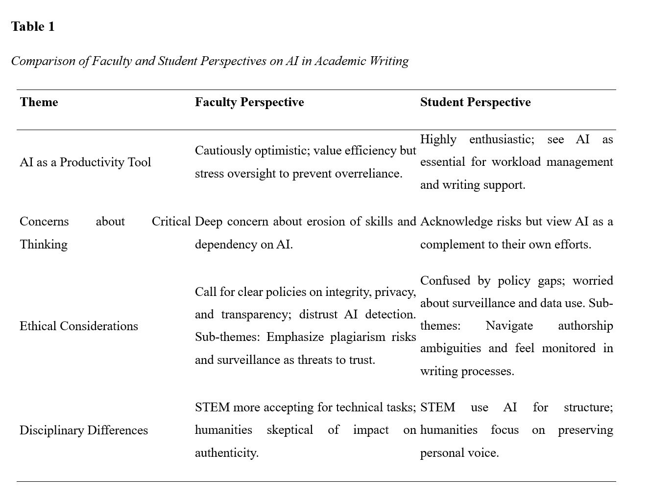 This qualitative study examines the complex attitudes, ethical considerations, and practical implications of integrating artificial intelligence (AI) in academic writing across key stakeholder groups, including university professors and students. Using semi-structured interviews with 40 participants (20 students and 20 faculty members) from diverse disciplines and institutional contexts, the research reveals divergent perspectives on AI’s role in academia. Faculty respondents expressed significant concerns about academic integrity, erosion of critical thinking, and the limitations of AI detection tools, which frequently misidentify human-written text as AI-generated. Conversely, students viewed AI as an essential productivity tool for overcoming writer’s block, refining ideas, and managing workload, though they acknowledged ethical ambiguities in its deployment. A critical tension emerged between AI’s perceived benefits—enhanced efficiency, personalized feedback, and accessibility—and its risks, including algorithmic bias, surveillance culture, and threats to student agency. Stakeholders agreed that institutional policies lag behind technological adoption, with current frameworks inadequately addressing transparency, data privacy, or equitable implementation. The study also identifies disciplinary variances: STEM educators favored AI for technical drafting, while humanities faculty emphasized its threat to authentic voice development. The findings advocate for a collaborative, multi-stakeholder approach to AI governance, emphasizing pedagogical redesign, ethical guidelines for explainable AI, and professional development to bridge digital literacy gaps. This research underscores the urgency of reimagining academic writing in the AI era, balancing innovation with the preservation of core educational values.