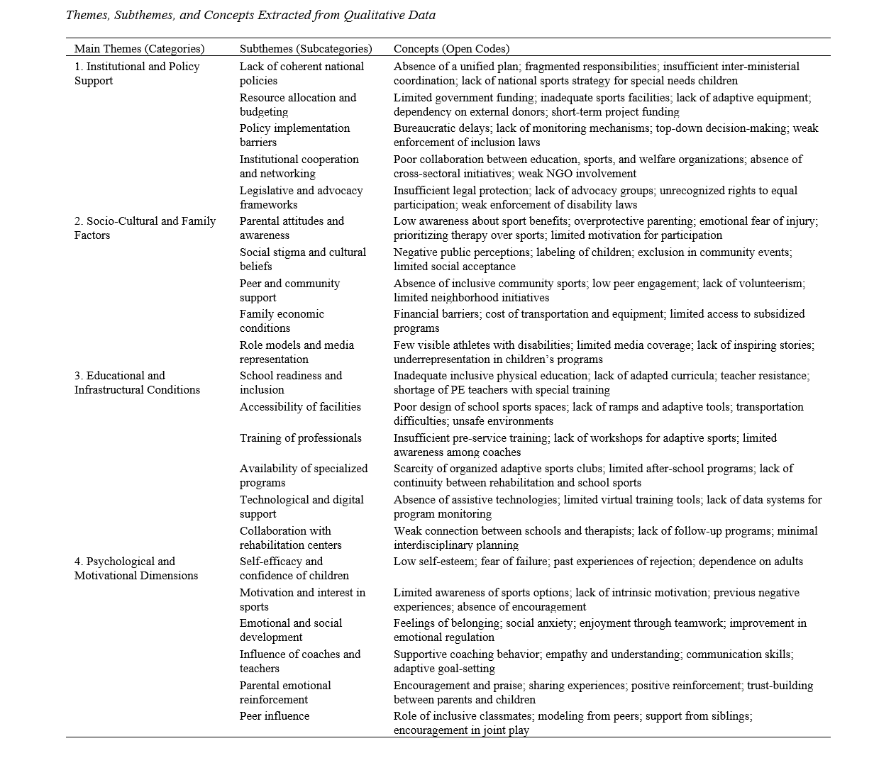 The present study aimed to identify and analyze the key institutional, educational, socio-cultural, and psychological factors that influence the development of sports for children with special needs in Tehran. This study employed a qualitative research design using a phenomenological approach to explore the lived experiences and perceptions of stakeholders involved in inclusive sports. The participants included 21 individuals comprising teachers, parents, coaches, rehabilitation specialists, and policymakers selected through purposive sampling from Tehran. Semi-structured, in-depth interviews were conducted until theoretical saturation was achieved. Each interview lasted between 45 and 75 minutes and was transcribed verbatim. Data were analyzed using thematic analysis, following Braun and Clarke’s six-step model, with the assistance of NVivo 14 software to facilitate systematic coding and theme extraction. Trustworthiness of the results was ensured through member checking, peer debriefing, and maintaining an audit trail in accordance with Lincoln and Guba’s criteria. Analysis revealed four overarching themes: (1) Institutional and policy support, encompassing weak inter-organizational coordination and lack of inclusive policy frameworks; (2) Socio-cultural and family factors, including parental overprotectiveness, social stigma, and low public awareness; (3) Educational and infrastructural conditions, referring to limited accessibility, untrained staff, and insufficient adaptive facilities; and (4) Psychological and motivational dimensions, focusing on children’s self-efficacy, emotional development, and peer inclusion. These themes collectively highlight that inclusive sports development is constrained by structural, attitudinal, and environmental barriers, yet facilitated by supportive relationships and empathetic teaching practices. The findings demonstrate that effective development of sports for children with special needs requires integrated policy frameworks, inclusive educational reform, cultural transformation, and psychosocial empowerment.